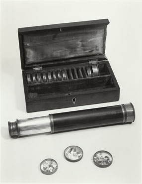 Sir David Brewster, designer, Brewsters patent kaleidoscope, extra lenses, object plates, and case, Phillip Carpenter, London, ca. 1820. Enameled brass, iron, ground glass, silver mounts, and mahogany. L. 6 5/16". (Courtesy, Science Museum, Science and Society Picture Library, London.)