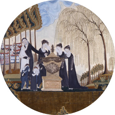 Mourning Piece for Mrs. Ebenezer Collins, attributed to Lovice Collins, South Hadley, Hampshire County, Massachusetts, 1807. Silk satin, silk velvet, watercolor, pencil, ink, silk thread, metallic thread, chenille thread, and printed paper label. Diam. 17" (sight). (Collection of the American Folk Art Museum, New York. Eva and Morris Feld Folk Art Acquisition Fund, 1981.12.8; photo, John Parnell, New York.)