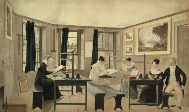 The Drawing Class: Samuel Folwells School, attributed to Samuel Folwell, America, 18101813. Watercolor over graphite on cream wove paper laid down on cream board. 14 2/3" x 24". (Courtesy, The Art Institute of Chicago. Gift of Mrs. Emily Crane Chadbourne, 1951.202; photo, © The Art Institute of Chicago.)