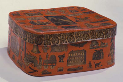 J. P. Hurlbert, bandbox with scraps, Boston, 18271829. Pasteboard, stereotype and wood-block scraps, and printed paper label. H. 4", W. 10 3/8", D. 7 1/2". (Courtesy, Old Sturbridge Village; photo, Henry E. Peach.)