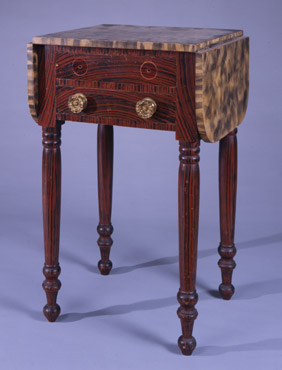 Philip H. Saunders, work table, Danvers, Massachusetts, 18201840. Pine and painted and smoke-grained decoration. H. 29 3/4", W. 18", D. 16 3/4". (From the Collections of Henry Ford Museum & Green€eld Village.) Written on the underside of the top drawer is: P H Saunders/Mill St Danvers.