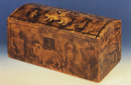 Dome-top box, America, ca. 1835. Wood and painted, smoked, and stenciled decoration. H. 10 3/4", W. 23 3/4", D. 11 3/4 ". (Courtesy, Abby Aldrich Rockefeller Folk Art Museum, Colonial Williamsburg Foundation, Williamsburg, Virginia.)