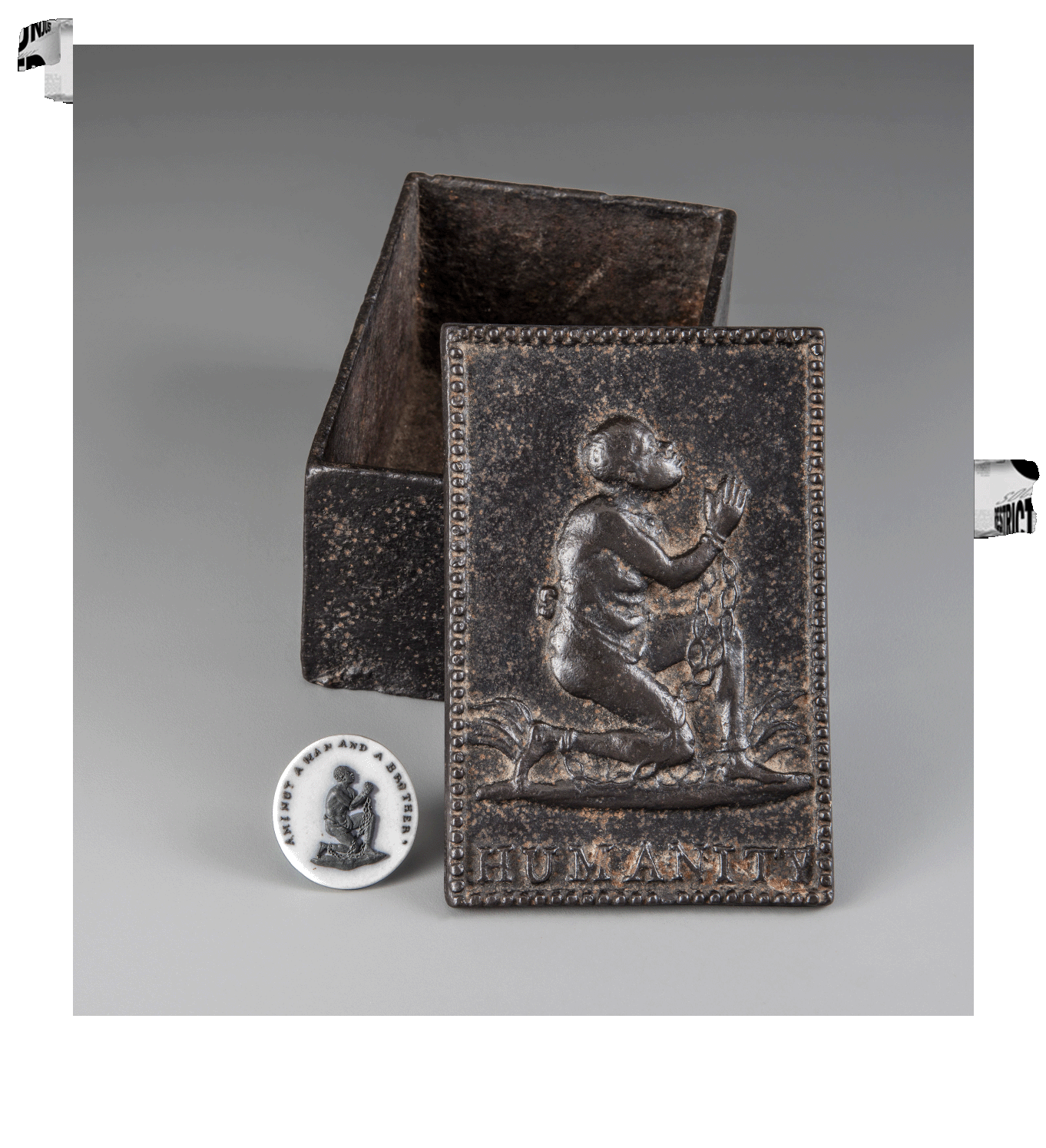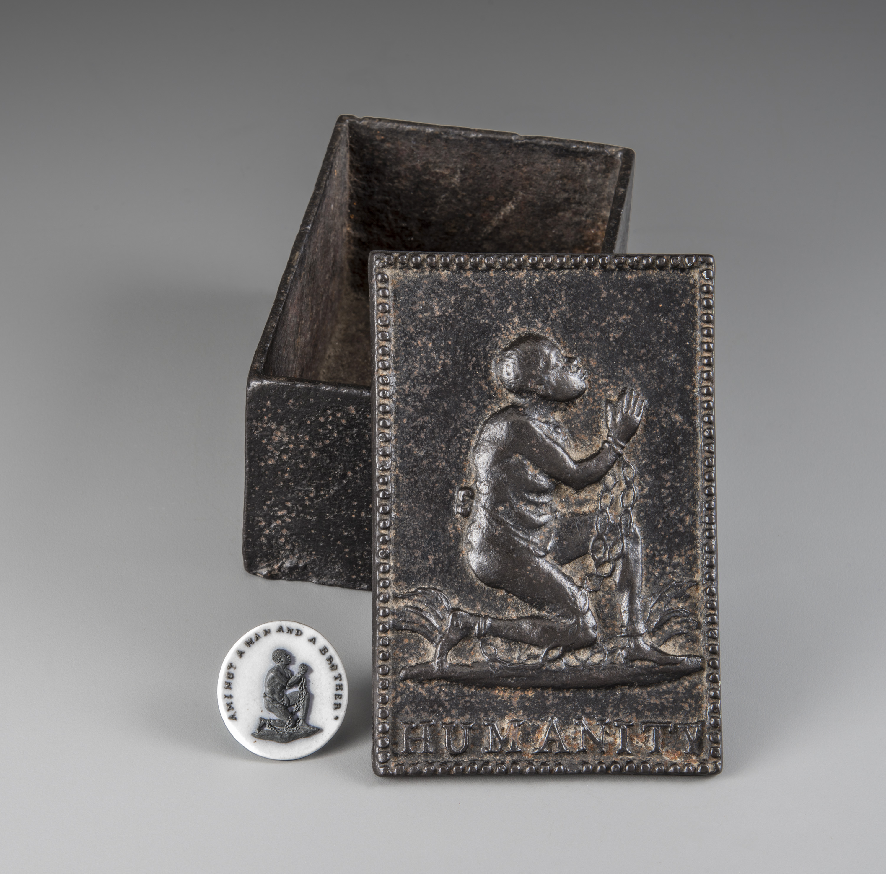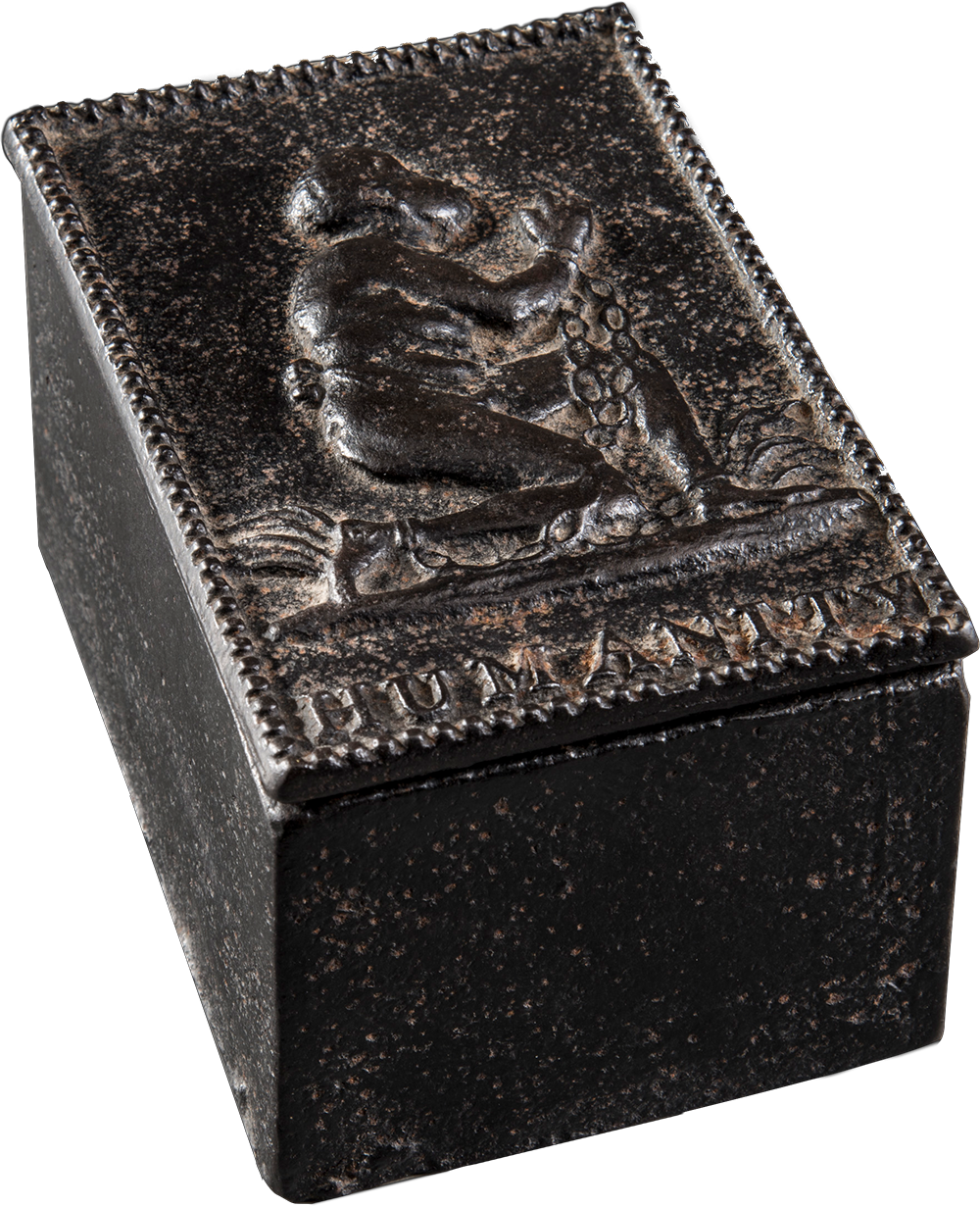 Created in England with the intention of sale on the abolitionist market, this cast iron box made to keep tobacco leaves fresh was one of the many products meant to end slavery in the Americas. On the lid is a depiction of a Black man shown either kneeling or praying with his hands clasped, a pose that was meant to help convince abolitionists that enslaved people deserved freedom.