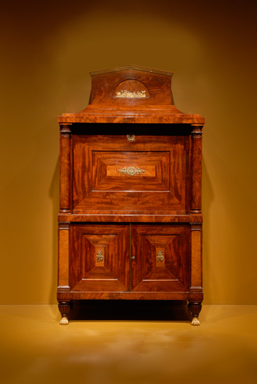 The Secretaire à Abattant seen here, a French form that gained favor in America in the 1820s,is unmistakably rooted in classical architecture. Its thick columns and pilasters have meticulously carved capitals. The dark mahogany and light maple veneer create contrasting geometric shapes, a decorative device common in ancient architecture. The gilt appliqués on the lower doors feature torches, Roman symbols of liberty. Silliman saw little purpose in this “solemn affectation of Greek and Roman forms” and preferred furniture more obviously suited to its intended use.