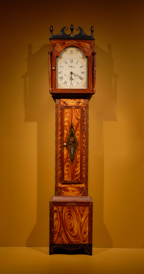 Prior to the early nineteenth century, “grain painting” had long been used by ornamental painters to make common pine resemble more expensive woods or marble. This mode of decoration saw a great spike in popularity with the rise of the Fancy style between 1800 and 1840. Ornamental painters such as J. D. Green, who painted the clock seen here, used bright yellow paint and brown washes to create dramatic swirls and loops that looked even more exuberant than real mahogany or rosewood. By the mid-nineteenth century, the fad for Fancy grain-painted furniture and interior architectural woodwork was waning. Village and Farm Cottages, a design book for house carpenters, advised against the “rage” of graining and put it squarely in the category of “senseless fashion.”