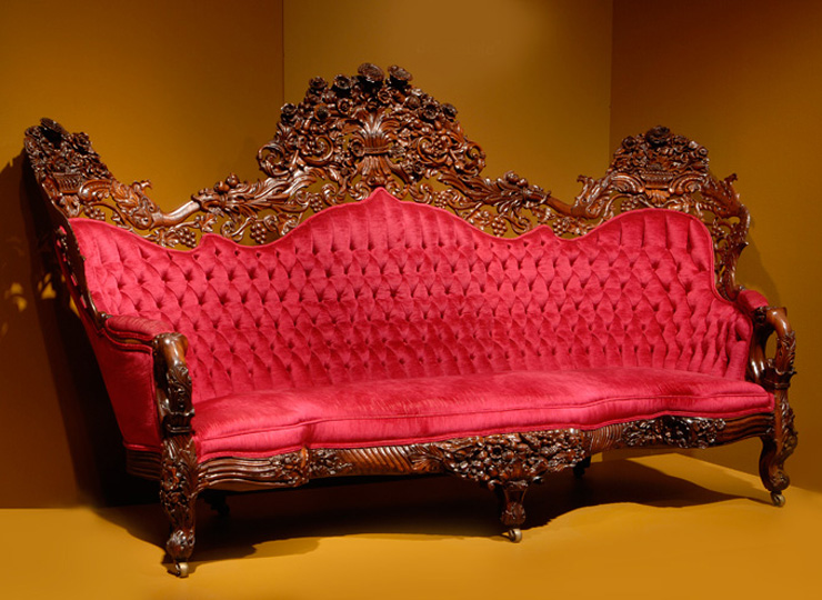By the 1850s, most furniture in America was made in factories instead of small shops. This expanding industry helped consumers furnish their homes stylishly. A few decades later, however, upper-class tastemakers concluded that machines made bad furniture. Mariana Griswold van Rensselaer was a fashionable New Yorker who wrote articles about art, architecture, and gardening for prominent magazines. She criticized industrially produced furniture like the sofa seen here because it flaunted unnecessary and “hideous” ornament. It also concealed its construction, which she found “false and detestable.” This sofa was made in a New York factory operated by John Henry Belter, a German immigrant who patented a wood-steaming process that layered thin rosewood veneers on top of one another to produce elaborate three-dimensional floral patterns. This machine-aided system allowed Belter to efficiently create furniture that revived the appearance of eighteenth-century Rococo-style hand carving. In the 1880s, Mrs. Van Rensselaer and her fellow art critics began to shift fashionable taste away from the types of elaborate decoration seen on this sofa toward straightforward production techniques and simple ornament. Furniture design, they argued, should be based on carefully defined principles of art and beauty taught in urban art schools.