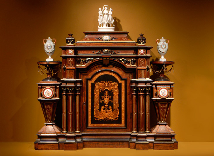 Monumental sideboards and cabinets like the example seen here brought the sophistication of the Italian Renaissance into American homes in the late nineteenth century. The delicate vase and vines depicted in toned wood in the central marquetry panel were based on designs from ancient Roman frescoes. Also inspired by the art of antiquity were the architectural columns, capitals, and circular plaques enameled with romanticized images of angels.