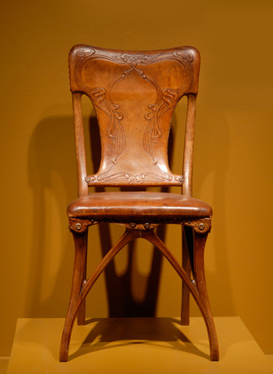 Compared to many earlier styles, the French Art Nouveau—or “New Art”—was less reliant on historic or classical ornament. Taking inspiration from nature, designers like Eugène Gaillard created furniture with elongated curves and rounded edges that often resembled old-growth trees, climbing vines, or waves in the water. They often incorporated leather upholstery tooled with additional abstract ornament as seen in this chair. While Europeans generally praised these creative designs, many American critics found Art Nouveau to be too idiosyncratic and impractical. Architectural historian A. D. F. Hamlin regarded Gaillard’s furniture as “capricious, eccentric, and obviously impossible to harmonize with any room.” Hamlin preferred the Beaux Arts style, which drew on its own strange amalgam of Classical, Baroque, and Rococo architectural precedent. Hamlin’s hope that the French “seed” would not be “sown” in American soil came true. American designers in general bypassed the Art Nouveau and picked up Modernist and Arts and Crafts styles instead.