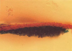 Cross-section of a red stripe on the Masonic Masters chair photographed in visible light at 500x. (Photo, Susan Buck.)