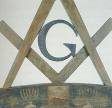 Post-treatment detail of the crest rail, G, compass, and square. Although cleaning helped reveal the red paint and blue glaze, the metallic powder layers remained darkened and corroded. (Photo, David Bohl.)