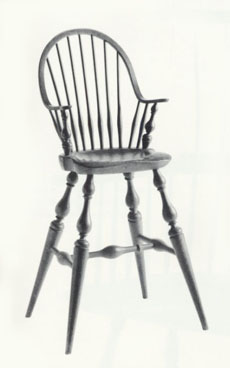 | Figure 27 Continuous-bow Windsor highchair, Wallace Nutting, Framingham, Mass., 1930s in style of 1790s. White pine (seat), birch, and oak (microanalysis). H. 37", W. (arms) 15 1/8", D. (seat) 12 3/4". (Courtesy, Winterthur Museum, acc. 58.635.) |