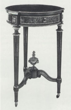 | Figure 16 Work table by L. Marcotte & Co., New York, 1869. Walnut and burl walnut veneer. H. 27", Diam. 18 1/2". This table is particularly French with delicately proportioned legs joined by a gracefully curved stretcher. (Photograph by David Bohl in addition to Courtesy of the Society for the Preservation of New England Antiquities, acc. 1969.2126.) |