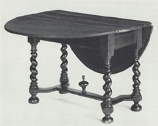 | Figure 12 Oval table with falling leaves, New York City, 16801710. Walnut with pine. H. 28 1/2"; top: 42 3/4" x 19" (center section only). The leaves, finial, and possibly the feet are modern replacements. (Courtesy, Winterthur Museum, acc. 59.5.) |