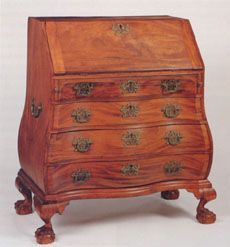 Desk attributed to John Cogswell, Boston, 17801784. Mahogany with white pine. H. 42 3/4", W. 37 3/8", D. 19 5/8". Only two serpentine front bombé desks are known. (Private collection; photo, David Bohl.)