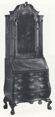 Desk-and-bookcase attributed to John Cogswell with carving possibly by William Burbeck, Boston, 17801785. Mahogany with white pine. H. 82 1/16", W. 37 1/4", D. 20 9/16". (Courtesy, Winterthur Museum, acc. 57.1396.)