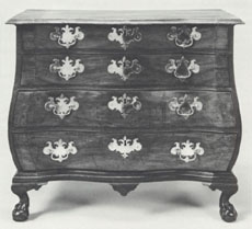 | Figure 41 Chest of drawers attributed to the shop of John Cogswell, Boston, 17801795. Mahogany with white pine. H. 31 3/8", W. 36 1/8", D. 20". This chest is the only one of the group that survives with remnants of the original finish. (Courtesy, Art Institute of Chicago, Helen Bowen Blair Fund, acc. 1979.499, photo copyright 1992. All rights reserved, ©The Art Institute of Chicago.) |