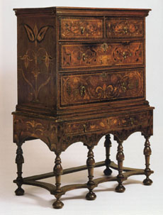 High chest possibly decorated by Charles Gillam, Saybrook or Guilford, Connecticut, 17031725. Pine, tulip poplar, and ash. H. 54 5/8", W. 40 1/8", D. 21 1/8". (Courtesy, Winterthur Museum.)