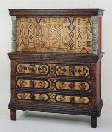 Cupboard, inscribed Hannah Barnard, Hadley, Massachusetts area, ca. 1715. Oak and yellow pine. H. 61 1/8", W. 50", D. 21 1/4". (From the collection of the Henry Ford Museum and Greenfield Village; photo Amanda Merullo.)