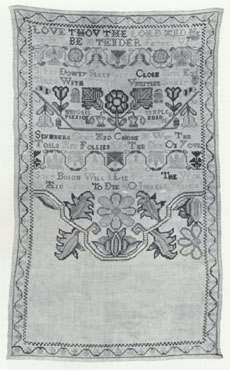 Sampler by Abigail Pinniger, Rhode Island, 1730. Silk on linen. 16" x 9 3/4". (Courtesy, Museum of Art, Rhode Island School of Design, gift of Miss Susan B. Thurston, 14.60.)