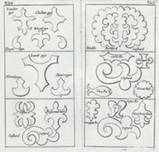 Diagram on pages 324-325 of pie crust vents from The Accomplisht Ladys Delight by Hannah Wolley, 1675. Reference (shelfmark) Douce P 412. (Courtesy, Bodleian Library, University of Oxford.)