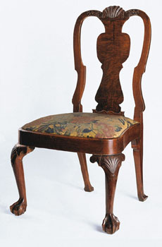 | Figure 16 Side chair with carving attributed to John Welch, Boston, 17401750. Walnut and walnut veneer with maple and white pine; maple slip seat. H. 38 1/2", W. 22", D. 18 3/8". (Courtesy, Brooklyn Museum; photo, Gavin Ashworth.) The veneer on the splats of these chairs appears to be from the same flitch as those of the set including the chair illustrated in fig. 21. |