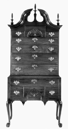 | Figure 22 High chest with carving attributed to John Welch, Boston, 17401750. Mahogany with white pine. H. 95 1/8", W. 41 1/4", D. 22 1/8". (Courtesy, Collection of Dorothy McIlvain Scott, Promised Gift to the Baltimore Museum of Art.) |