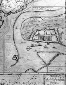 | Figure 2 A Plan of the TOWN & HARBOUR of CHARLES=TOWN, shown on the map illustrated in fig. 1. The Dutch residences are designated Vnderwood and Vandross. Joiner Pierre Le Chevaliers house in Charleston is 4, and the Huguenot church is R. By 1704, there were two churchesFrench and Englishand three meeting housesPresbyterian, AnaBaptist, Quakerin the Charleston vicinity. (Courtesy, South Caroliniana Library, University of South Carolina, Columbia, South Carolina) |
