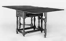 | Figure 24 Gateleg table, northern Europe, 16801720. Red pine. H. 28 1/2"; top: 38" x 67 1/4" (open). (Courtesy, Charleston Museum; photo, Gavin Ashworth.) Damage to the rail below the replaced drawer suggests that the original was missing for some time; however, the current cypress drawer appears to be an early eighteenth-century Carolina replacement. The battens under the leaves are chamfered and dovetailed in the same manner as those illustrated in figs. 22 and 23. The turnings of this table are very similar to those on late seventeenth-century chairs from southwestern France. (Courtesy, The Charleston Museum, Charleston, South Carolina; photo, Gavin Ashworth.) http://charlestonmuseum.org |