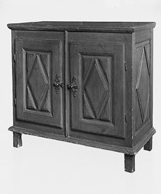 , Quebec, ca. 1700. Red pine painted red. H. 39 3/4", W. 41 5/8", D. 19". (Courtesy, Historic Deerfield.)
