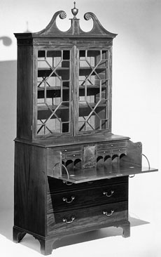 | Figure 28 Secretary-and-bookcase labeled by William Appleton, Salem, Massachusetts, 17951804 (based upon label address at Charter and Liberty Streets.) Mahogany and mahogany veneer with white pine. H. 97 1/2", W. 43 1/4", D. 24 3/8". (Courtesy, Winterthur Museum.) |