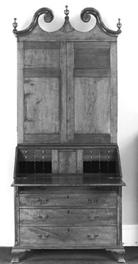 | Figure 28 Desk-and-bookcase, Knoxville area, Tennessee, 17951810. Cherry with yellow pine. H. 96" (without feet), W. 42 1/2", D. 22 3/4". (Courtesy, Lawson-McGhee Library; photo, John Bivins.) This example is somewhat unusual in being made of cherry. Walnut is the most common primary wood in East Tennessee furniture. |