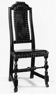 Side chair, Boston, ca. 1725. Maple and oak; original leather upholstery. H. 43 3/4", W. 18 1/2", D. 15". (Private collection; photo, Gavin Ashworth.)