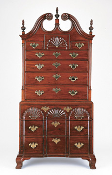Chest-on-chest, Newport, Rhode Island, 17621775. Mahogany with chestnut, cherry, and pine. H. 82 1/2", W. 42", D. 21 1/2". (Courtesy, Chipstone Foundation; photo, Gavin Ashworth.)