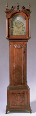 Tall case clock with movement by Seril Dodge, Providence, Rhode Island, 17651785. Mahogany with white pine and maple. H. 85 1/2", W. 21", D. 10 5/8". (Private collection; photo, Sothebys.)