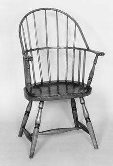 | Figure 15 Sack-back Windsor armchair, southeastern New Hampshire, 17901800. White pine (seat) with maple, ash, red oak, and white oak (microanalysis). H. 38 1/4", W. 23 1/2" (arms), D. 20 1/4" (legs). (Courtesy, Museum of Fine Arts, Houston, Bayou Bend Collection, gift of Miss Ima Hogg.) |