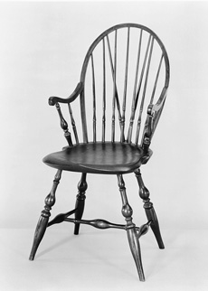 Bow-back Windsor armchair, Rhode Island, probably Providence, 17901800. White pine (seat) with maple, ash, and mahogany (arms). H. 38 3/8", W. 17 1/8", D. 19 3/4". (Courtesy, Colonial Williamsburg Foundation.)