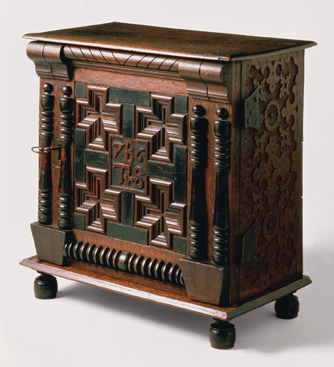 Cabinet attributed to the Symonds shops, Salem, Massachusetts, 1676. Red oak, red cedar, black walnut and soft maple (by microanalysis). H. 17 1/4", W. 17", D. 9 7/8". (Courtesy, Winterthur Museum; photo, Gavin Ashworth.)