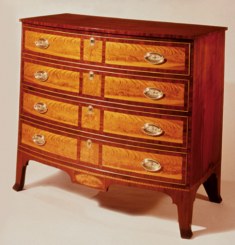 | Figure 22 Circular front bureau, Salem, Massachusetts, 17951813. Mahogany and birch with pine. H. 37 1/2", W. 41", D. 21 1/2". (Courtesy, Peabody Essex Museum; gift of Francis and Miriam Shaw.) The chest descended in the family of Salem merchant Aaron Waite. |