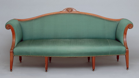 Sofa, possibly by Nathaniel Safford, with carving attributed to Samuel McIntire, Salem, Massachusetts, ca. 1805. Mahogany with unidentified secondary woods. H. 38 1/2", L. 83", D. 33". (Private collection; photo, Mark Sexton.)