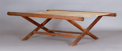 Folding cot, probably Salem, Massachusetts, nineteenth century. Maple, pine, iron, and canvas. H. 25", W. 79", D. 55". (Courtesy, Peabody Essex Museum; photo, Mark Sexton.)