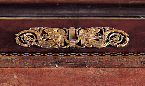 Detail of the bottom edge of the front apron on the card table illustrated in fig. 7 showing the unused rectangular mortise originally planned for a winged caryatid support. (Photo, Gavin Ashworth.)
