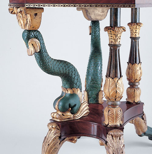 Detail of the card table illustrated in fig. 7 showing the way the dolphin’s body curves to the right as it extends to meet the incurvate corner of the table. (Photo, Gavin Ashworth.)