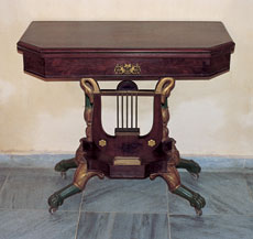 | Figure 4 One of a pair of card tables attributed to Charles-Honoré Lannuier, New York City, possibly 1819. Mahogany and mahogany veneer with white pine; gilded gesso, vert antique, gilded cast brass, and die-stamped brass banding. Dimensions not recorded. (Courtesy, Museo de Artes Decorativas, Santa Clara, Cuba.) The upper leaf of the table is a replacement, and the die-stamped brass banding on the lower edge of the apron is missing. The ornament on the center of the apron matches one on the plinth of the card table illustrated in fig. 17. Visible on the base of the lyre is the shadow outline of an original cast brass gilded ornament, which was identical to that at the base of the lyre on the card table shown in fig. 15. |