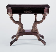 | Figure 6 One of a pair of card tables attributed to Charles-Honoré Lannuier, New York City, possibly 1819. Mahogany and mahogany veneer with white pine, ash, and possibly basswood; gilded gesso, vert antique, gilded cast brass, and die-stamped brass banding. H. 30 3/4", W. 36", D. 17 7/8". (Chipstone Foundation; photo, Gavin Ashworth.) This table is shown after conservation in fig. 7, and its mate is illustrated in fig. 11. |