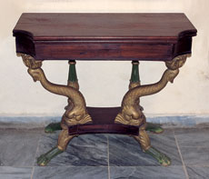 | Figure 11 One of a pair of card tables attributed to Charles-Honoré Lannuier, New York City, possibly 1819. Mahogany and mahogany veneer with white pine and yellow poplar; gilded gesso and vert antique. Dimensions not recorded. (Courtesy, Museo de Artes Decorativas, Santa Clara, Cuba.) The original cast brass gilded ornament, die-stamped brass banding, and inlaid stars and anthemions on the lower edge of the apron and the front edge of the upper leaf are all missing (see fig. 7). The hinged top may be a replacement. |