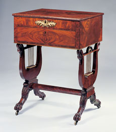 | Figure 18 Worktable attributed to Charles-Honoré Lannuier, New York City, 1815–1819. Mahogany and mahogany veneer with white pine and yellow poplar; gilded cast brass and brass stringing. H. 32 1/4", W. 23 3/4", D. 17 5/8". (Private collection; photo, Bruce White.) |