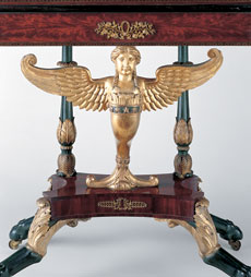 Figure 27 Detail of a caryatid support on a card table by Charles-Honoré Lannuier, New York City, 1817. Mahogany and mahogany veneer with white pine, yellow poplar, ash, and basswood; gilded gesso, vert antique, gilded cast brass, and die-stamped brass banding. H. 31 1/8", W. 36", D. 17 3/4". (Courtesy, Metropolitan Museum of Art, gift of Justine VR Milliken, 1995; photo, Bruce White.) This style of winged caryatid may be the earliest type produced in Lannuier’s shop. This table is one of a pair.