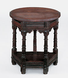 Folding table, Boston, Massachusetts, 1650–1680. Black walnut, red oak, maple, and cedrela with oak and white pine. H. 28 1/2", W. 28 3/4", D. 28 3/4" (open). (Chipstone Foundation; photo, Gavin Ashworth.)