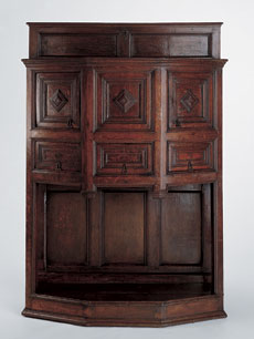 Cupboard, England, ca. 1540. Oak. Dimensions not recorded. (Private collection.) This remarkable early cupboard has a set-back upper section with “secret” sliding panels.