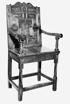 | Figure 43 Armchair, Shrewsbury, England, 1662. Oak. Dimensions not recorded. (Reproduced from Victor Chinnery, Oak Furniture: The British Tradition [Suffolk, Eng.: Antique Collectors’ Club, 1979], fig. 2.11.) Richard Ellis made this chair for the Shrewsbury Drapers’ Company. |